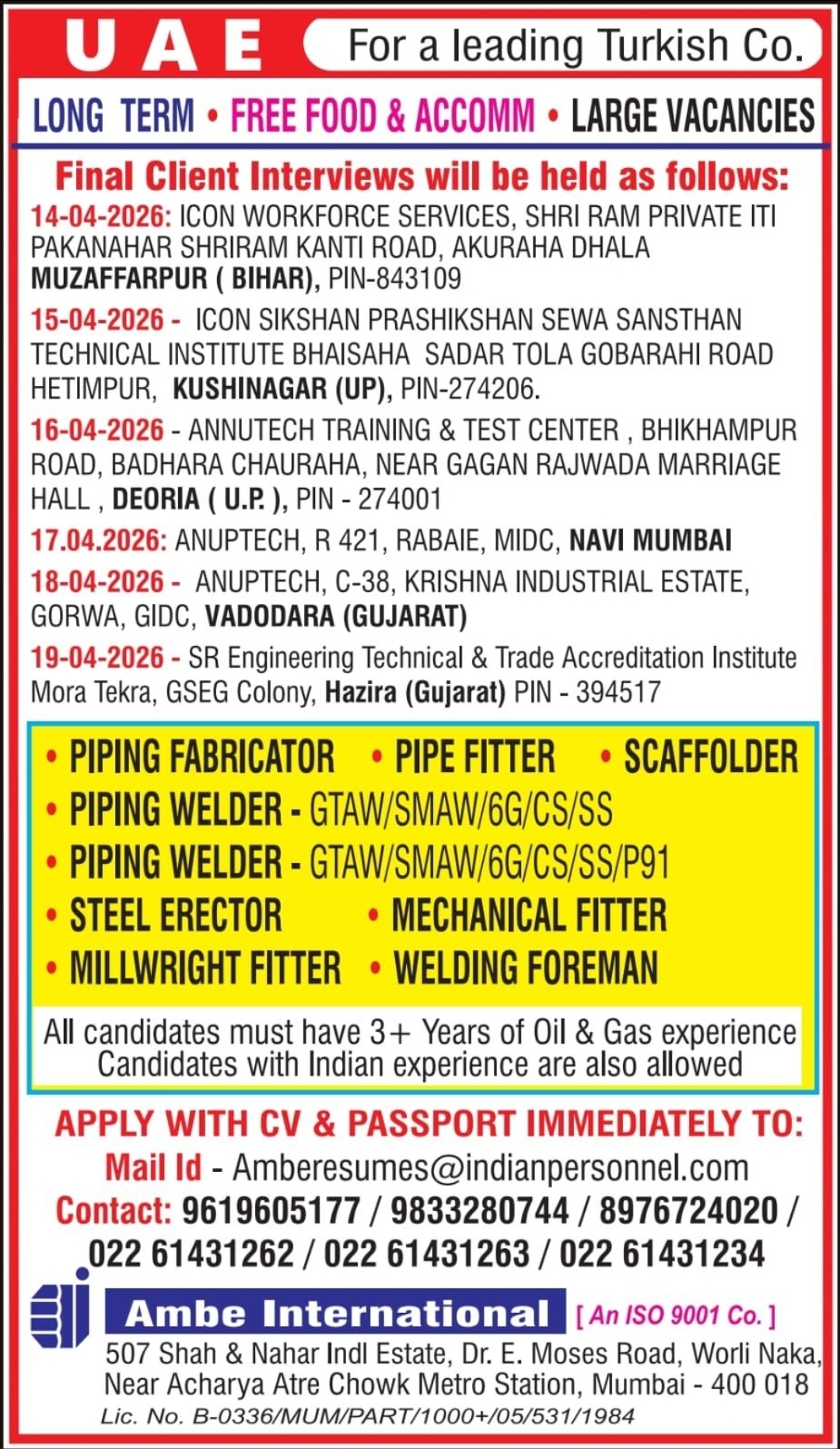 - Scaffolders (3rd Party Certified) – AED 1,500 monthly + free food & accommodation + daily overtime