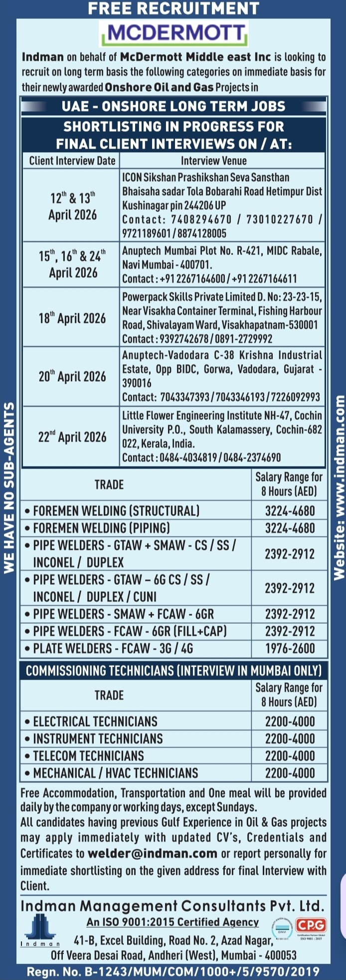 - Pipe Fitters – AED 1,500 to 1,800 monthly + free food & accommodation + daily overtime