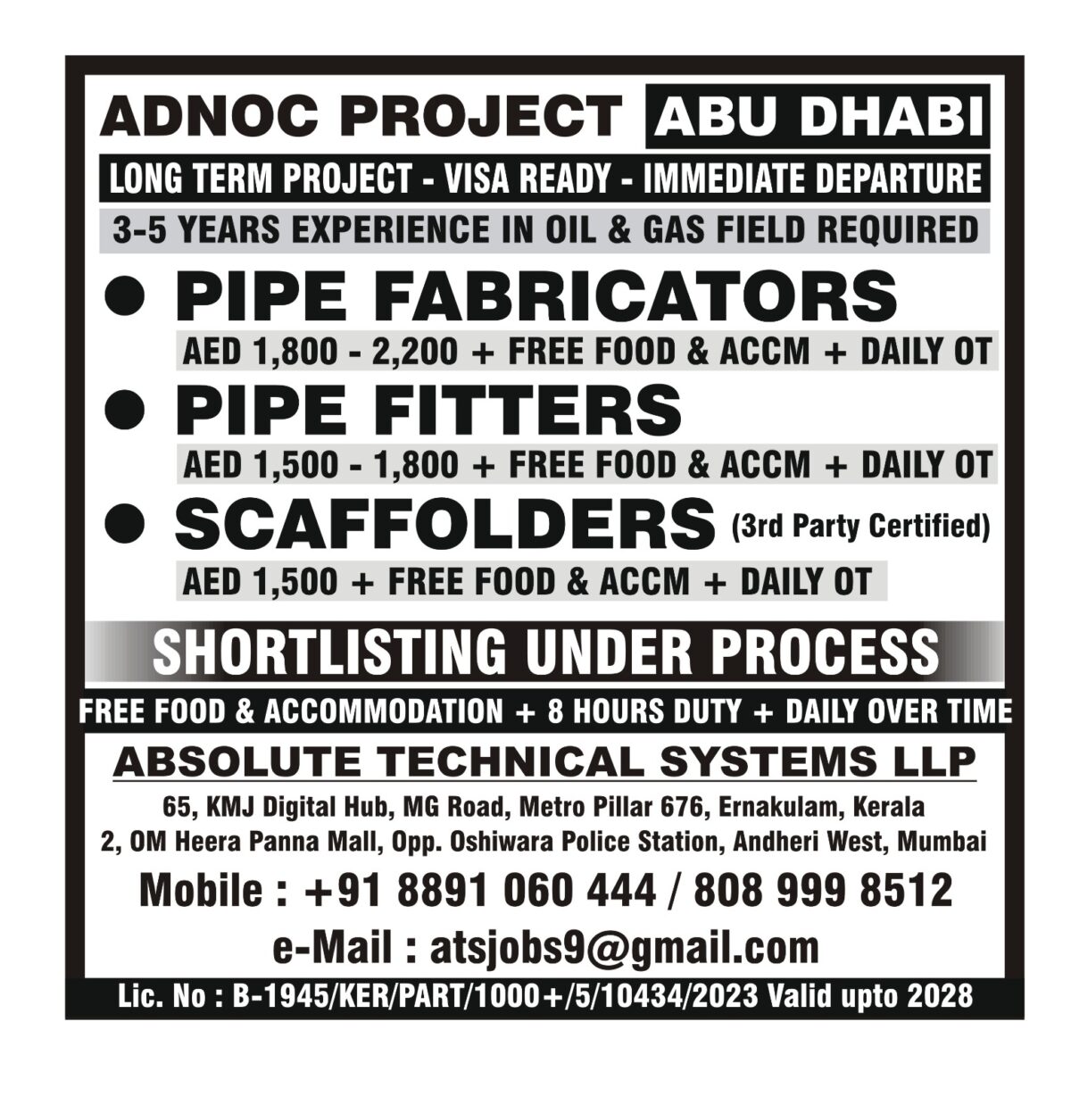 Looking for immediate offshore opportunities in Abu Dhabi? Absolute Technical Systems LLP is hiring experienced professionals for a long-term ADNOC project with visa ready status and immediate departure. This Abu Dhabi job vacancy is perfect for those with 3-5 years of experience in the oil and gas field.
