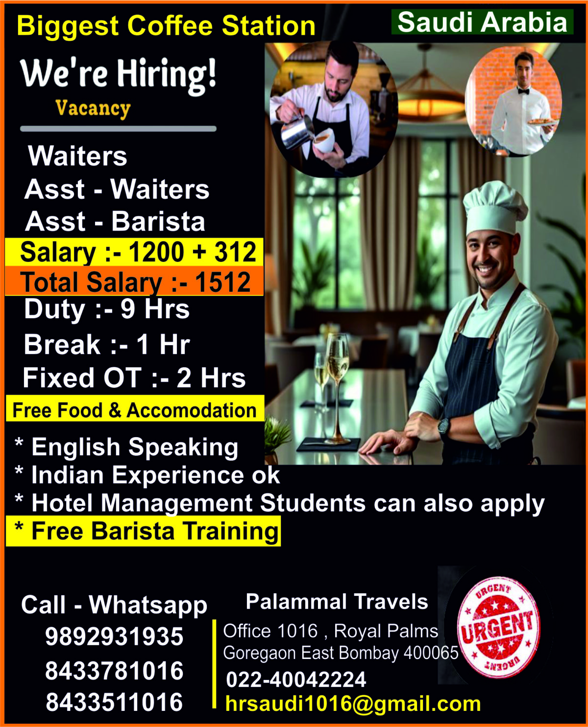 Worlds Biggest Coffee Parlour in Saudi Arabia is hiring , Barista , Waiters, Assit Waiters, Assit Barista , Hotel Management Passed Students