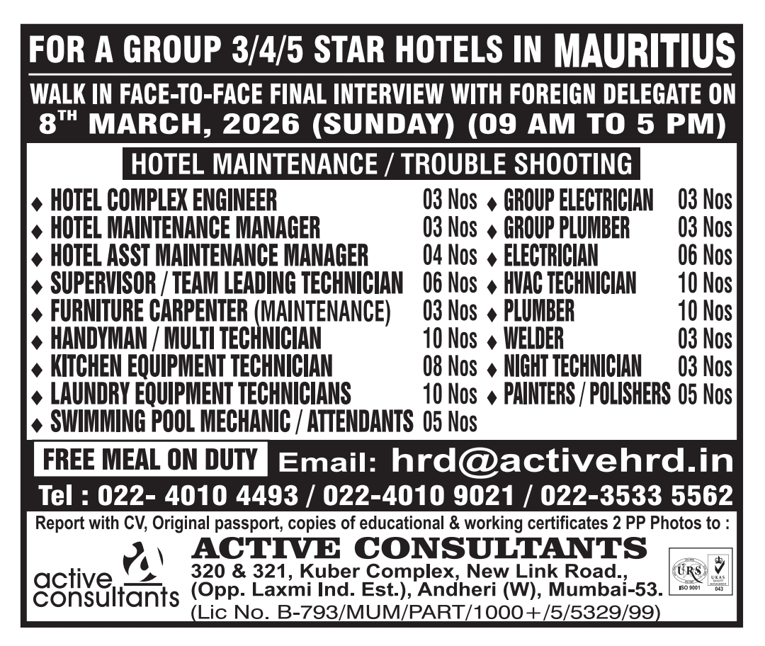 Key Requirements: Minimum 2 years of Indian experience in the maintenance field is mandatory for all positions.