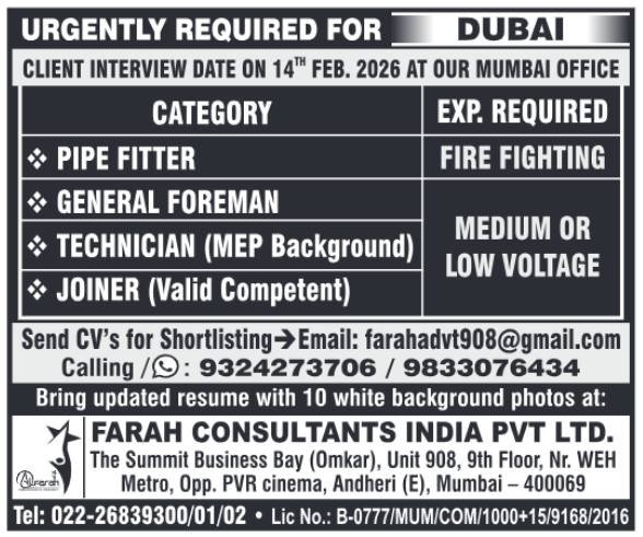The recruitment agency is conducting a Final Client Interview in Mumbai on the 14th of February. Candidates with either Indian or Gulf experience are eligible to apply.