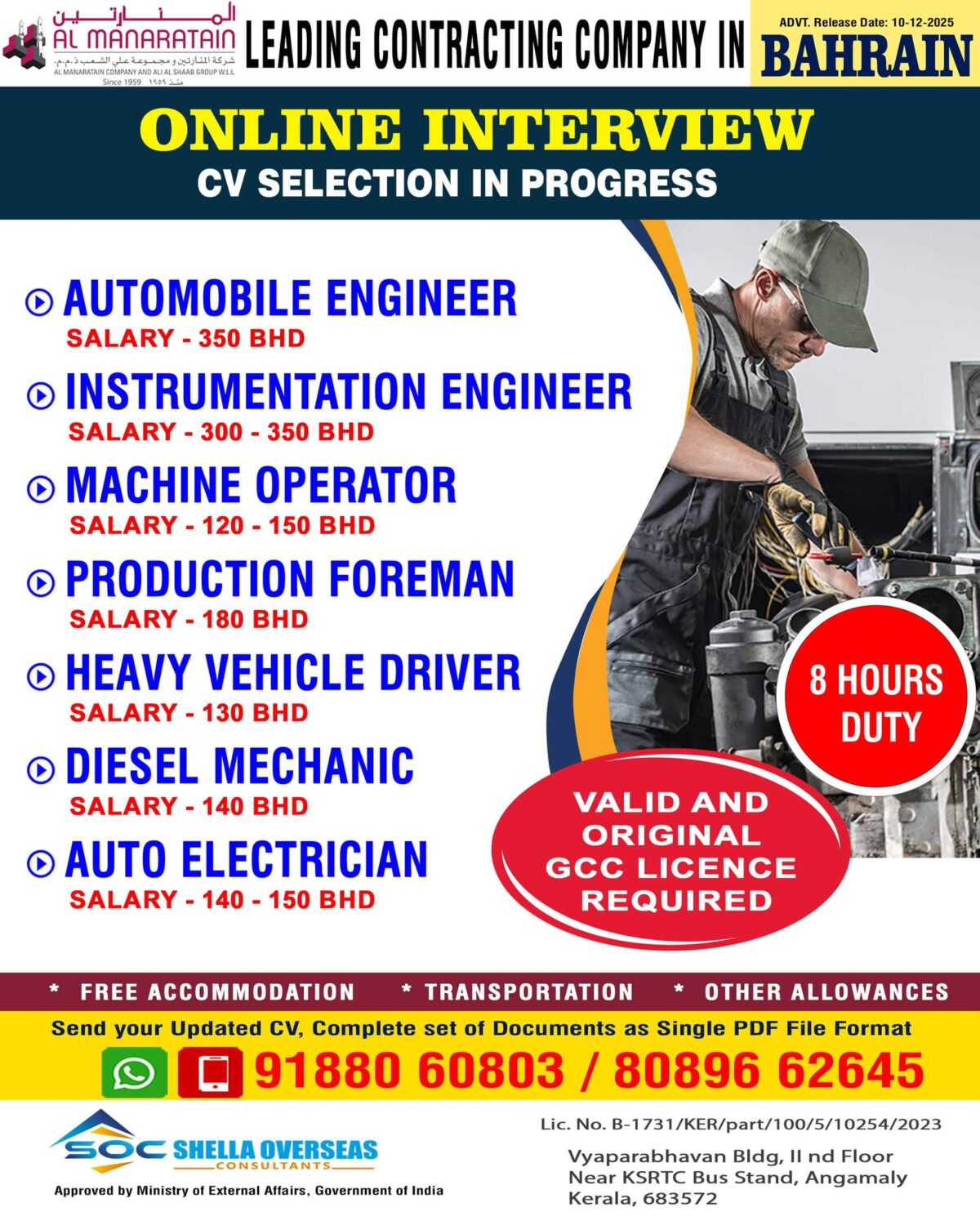 The hiring company, Al Manaratain Company and Ali Al Shaab Group W.L.L, is a well-established name in the industry. They have partnered with Shella Overseas Consultants to facilitate this recruitment drive. CV selection is currently in progress, and shortlisted candidates will be invited for an online interview. This method allows for a faster hiring process, making it easier for you to secure a position abroad without the initial need for travel.