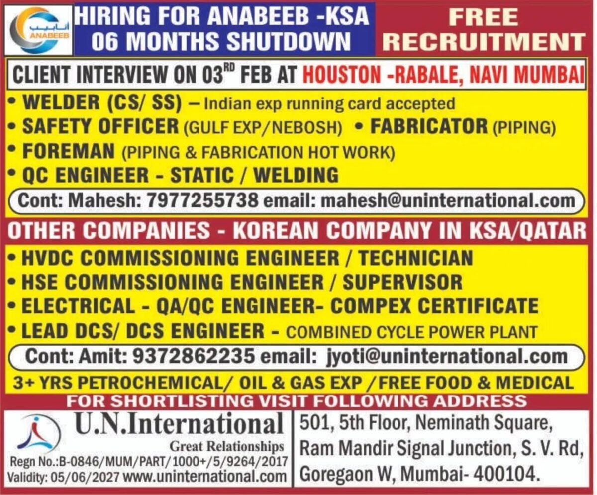 The recruitment agency is conducting a final client interview in Navi Mumbai on the 3rd of February. This drive is not just limited to Anabeeb; there are also openings for a Korean Company with projects in KSA and Qatar, offering a variety of high-level engineering roles.