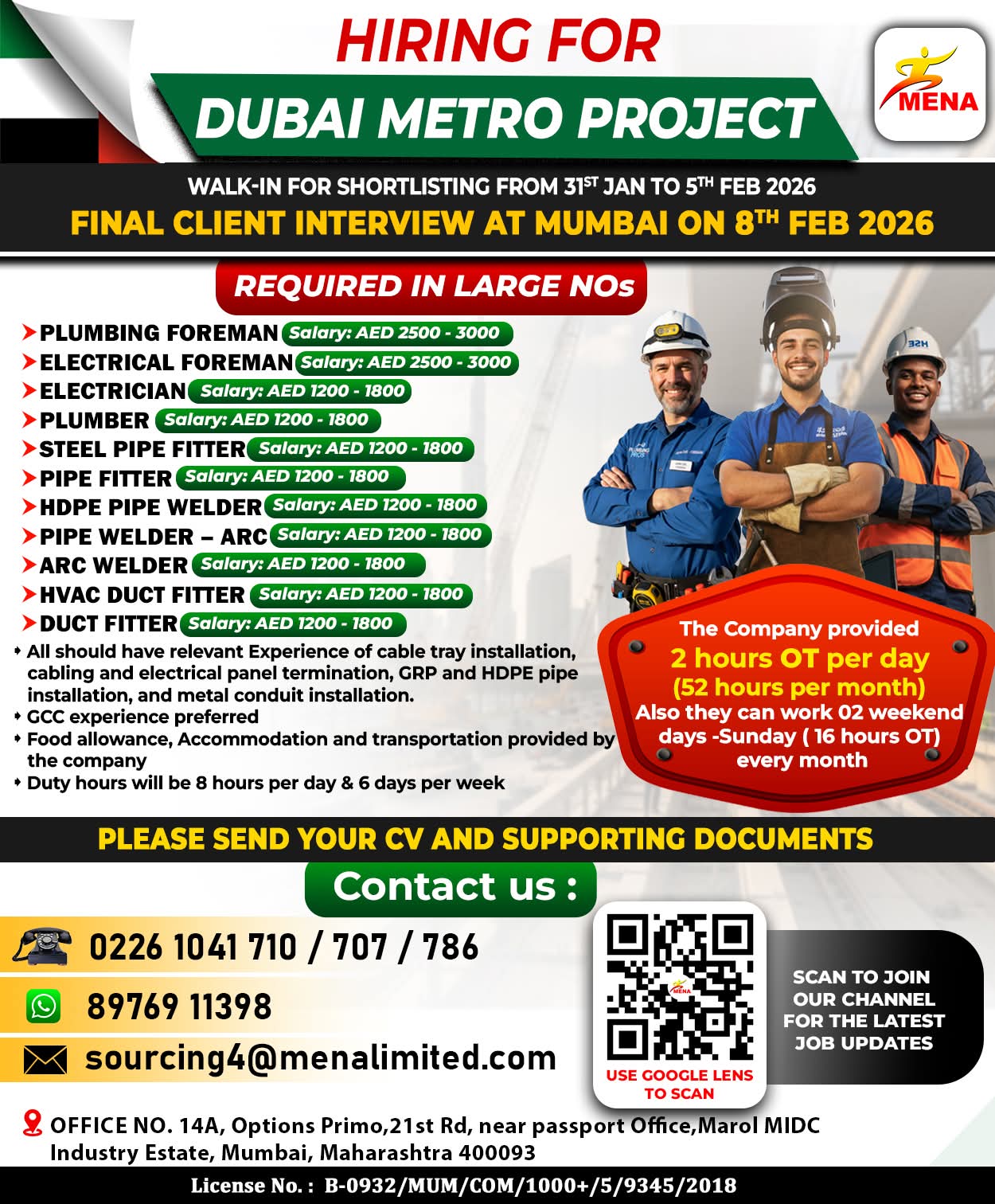 To secure one of these Free Recruitment UAE positions, candidates must attend the interview in Mumbai.