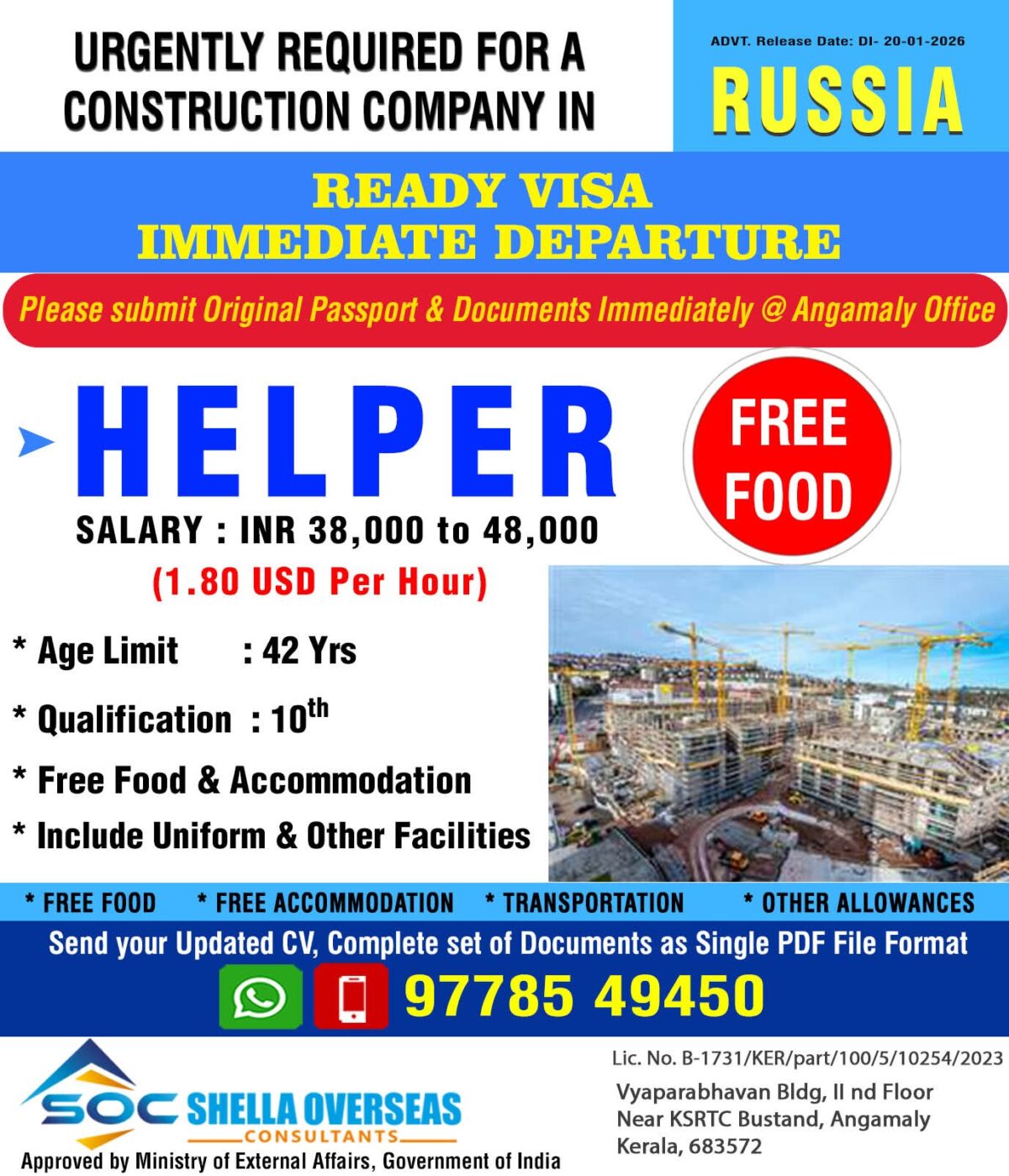 Jobs in Russia are currently opening up for skilled and unskilled workers looking for immediate employment opportunities abroad. Shella Overseas Consultants is organizing an urgent recruitment drive for a reputed construction company in Russia. With a “Ready Visa” status and immediate departure guaranteed, this is an excellent chance for candidates seeking quick deployment and a stable income.