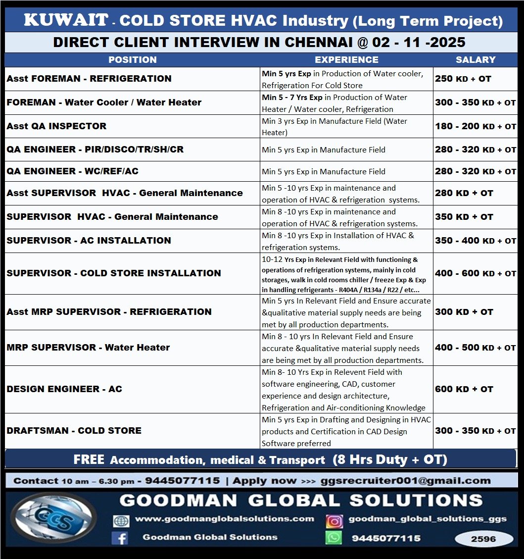 KUWAIT    – COLD STORE HVAC Industry  (Long Term Project)      DIRECT CLIENT INTERVIEW IN CHENNAI @ 02 – 11 -2025