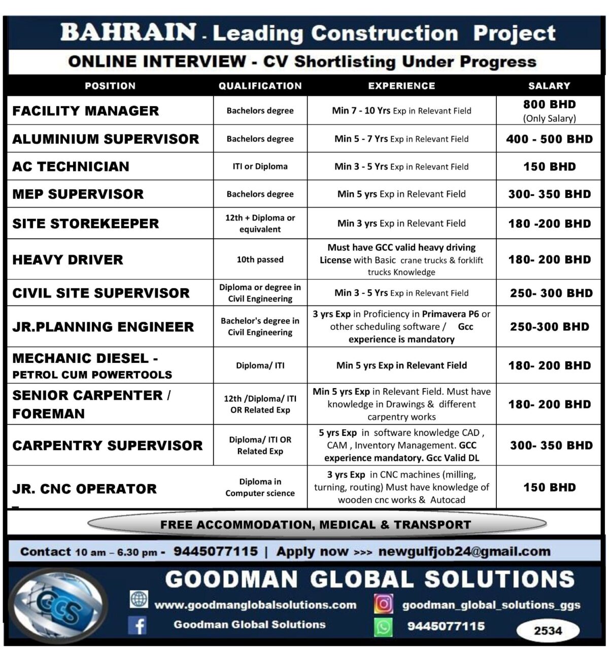 150 – 350 BHD Accommodation , Transportation, Medical
