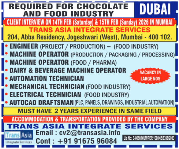 Middle East Free Recruitment vacancies are currently available for multiple manufacturing sectors, including Ceramic Tile FactoriesGenerator/Motor Companies, and Switchgear Manufacturing. Beta Consultancy HR Services has announced a recruitment drive for skilled professionals. This is a “Free Recruitment” opportunity where candidates with Indian Experience are eligible to apply.