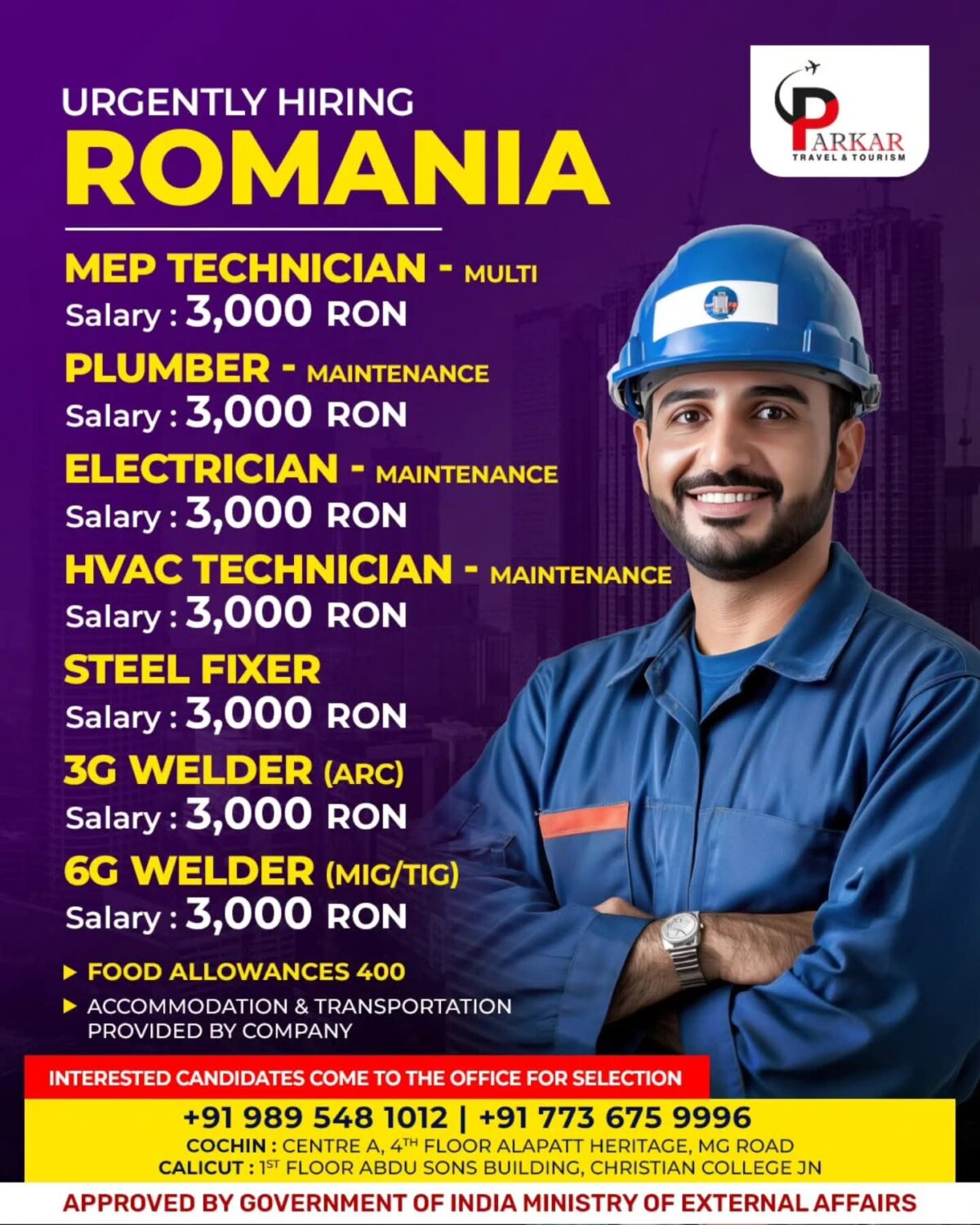 Romania job vacancy is now open for multiple technical positions. Parkar Travel & Tourism is urgently hiring skilled professionals for maintenance roles in Romania with attractive salaries and full benefits.