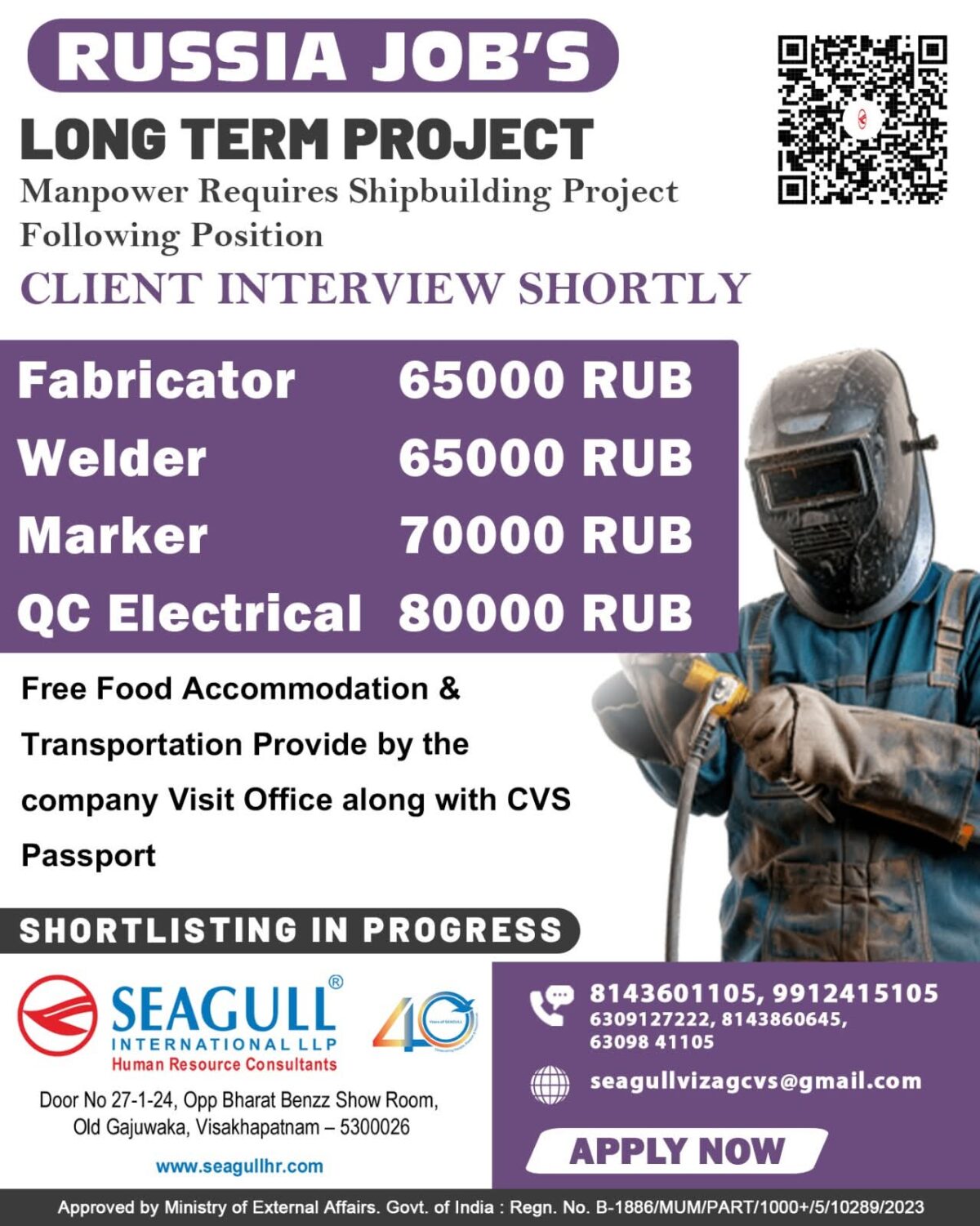 Russia Job Vacancy opportunities are available for a major Shipbuilding Project. Seagull International LLP has announced a client interview in Visakhapatnam (Vizag) for skilled technical professionals. This is a long-term project offering competitive salaries in Russian Rubles (RUB).