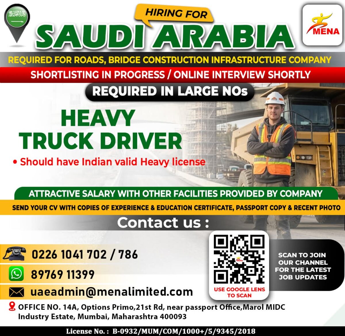 Saudi Arabia job vacancy for Heavy Truck Driver positions is now open with a leading roads and bridge construction infrastructure company. If you hold a valid Indian heavy license and are ready to work overseas, this is your chance to secure an attractive salary with excellent company benefits.