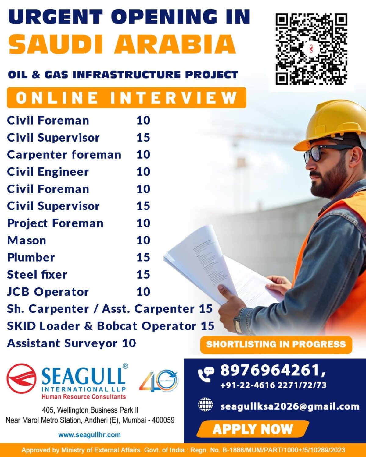 Ready to apply for this Saudi Arabia job vacancy? Contact Seagull International LLP right away. Call them at 8976964261 or +91-22-4616 2271/72/73. You can also reach out via email at seagullksa2026@gmail.com. The interview process is completely online, making it convenient for candidates.