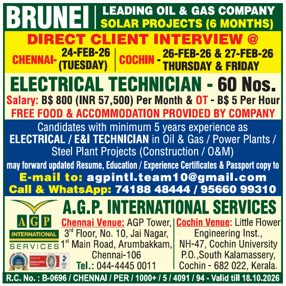 Kuwait Oil & Gas Jobs: Direct Interview in Cochin by Al Arab Arafa See Job Detail & Apply February 17, 2026 No Comments