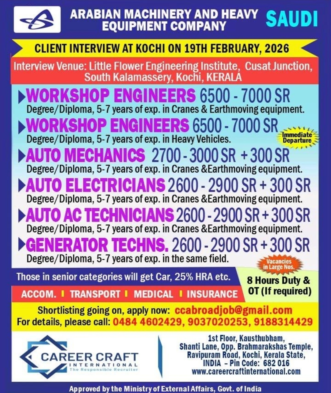 Saudi Arabia Jobs are currently available for Arabian Machinery and Heavy Equipment Company (AMHEC). Career Craft International has announced a recruitment drive for skilled engineers and technicians. If you have experience with cranes, earthmoving equipment, or heavy vehicles, this is an excellent opportunity offering Immediate Departure and attractive salaries.