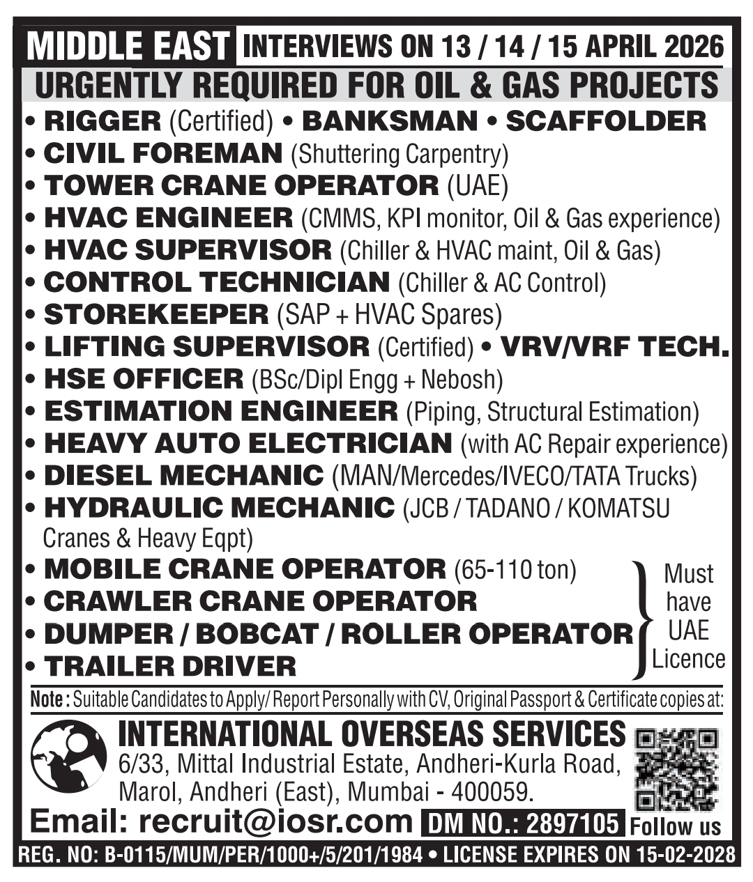 These roles are ideal for candidates with Gulf experience or those seeking to build a career in large-scale industrial and infrastructure projects in the Middle East.