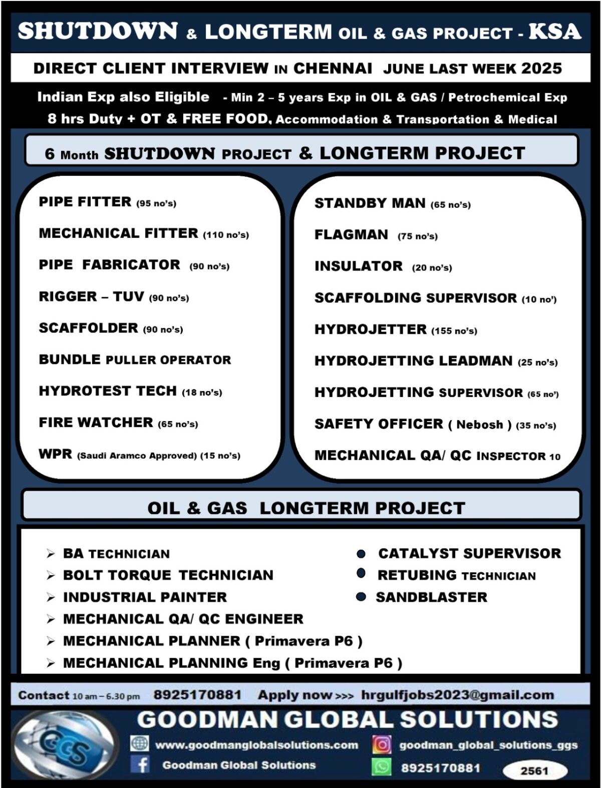 Indian Exp also Eligible – Min 2 – 5 years Exp in OIL & GAS / Petrochemical Exp 8 hrs Duty + OT & FREE FOOD, Accommodation & Transportation & Medical