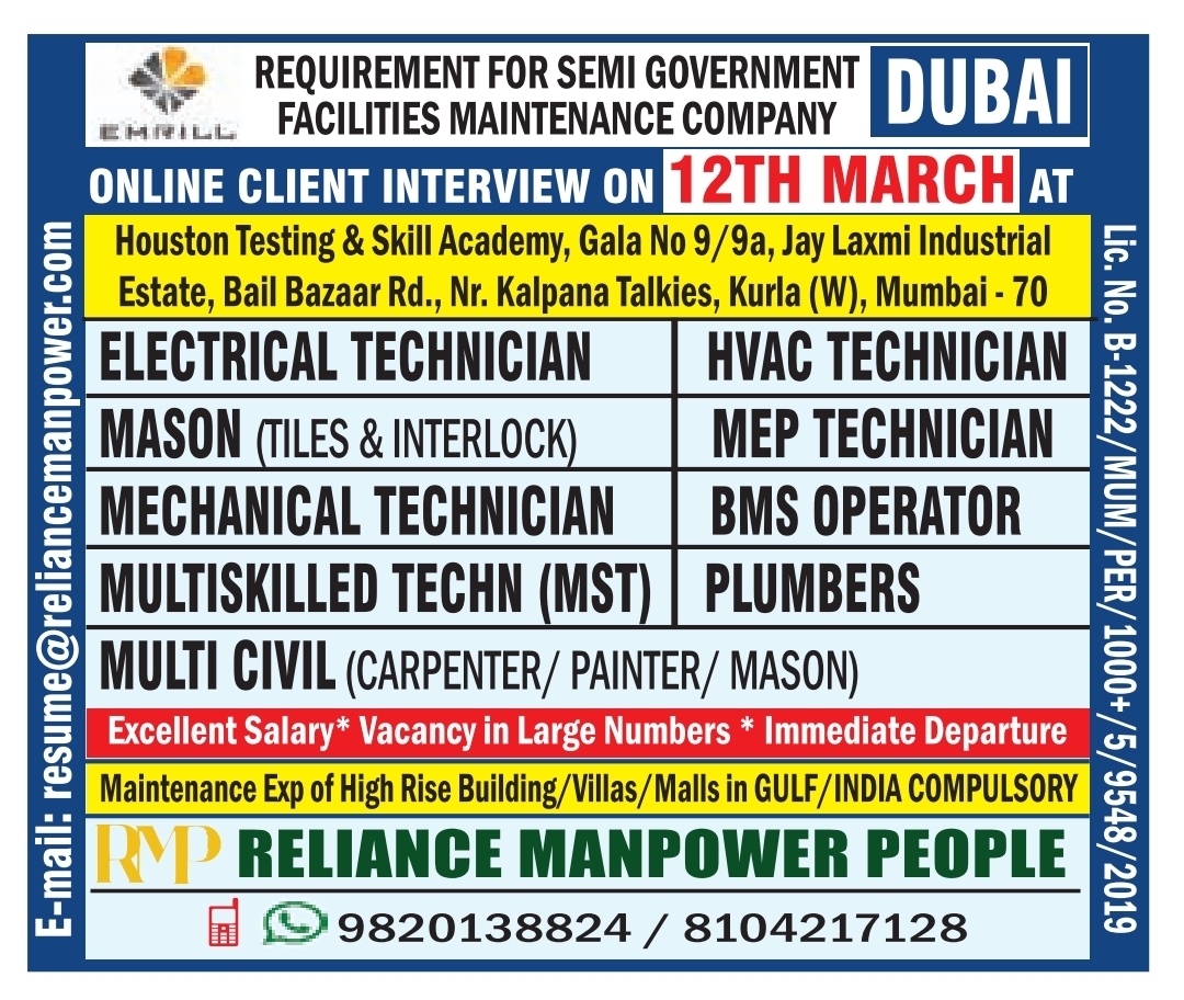 Dubai Job Vacancy – Urgent Hiring at RMP Reliance Manpower See Job Details & Apply Gulf Job List March 4, 2026 No Comments