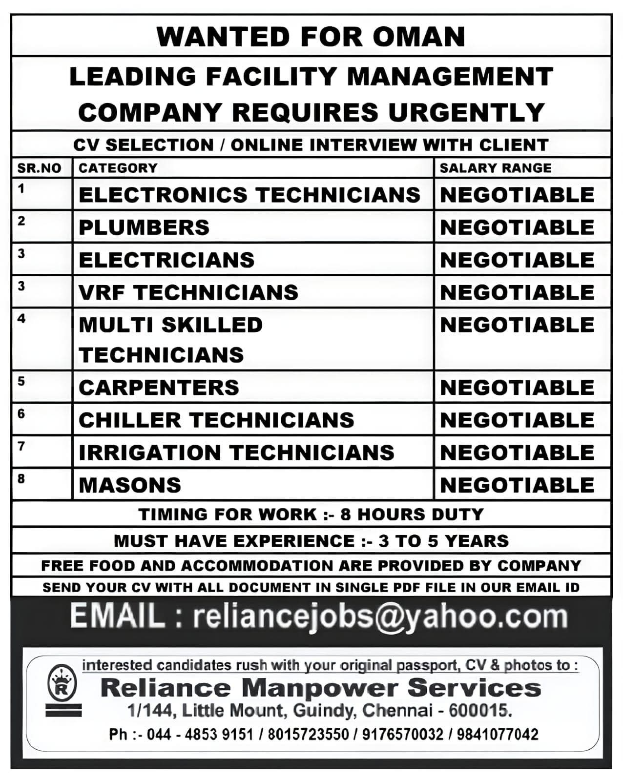 Job Vacancy in Oman: Urgent Hiring for Facility Management by Reliance Manpower