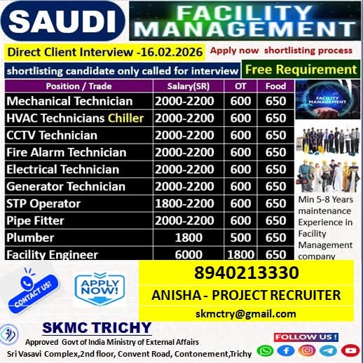 Saudi Arabia Job Vacancy: Free Requirement for Facility Management in Trichy