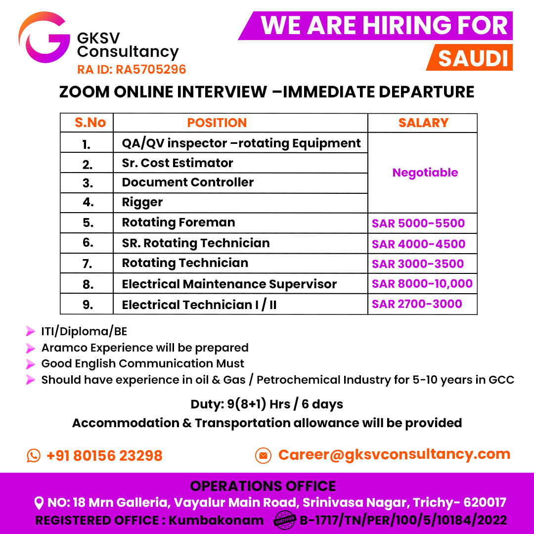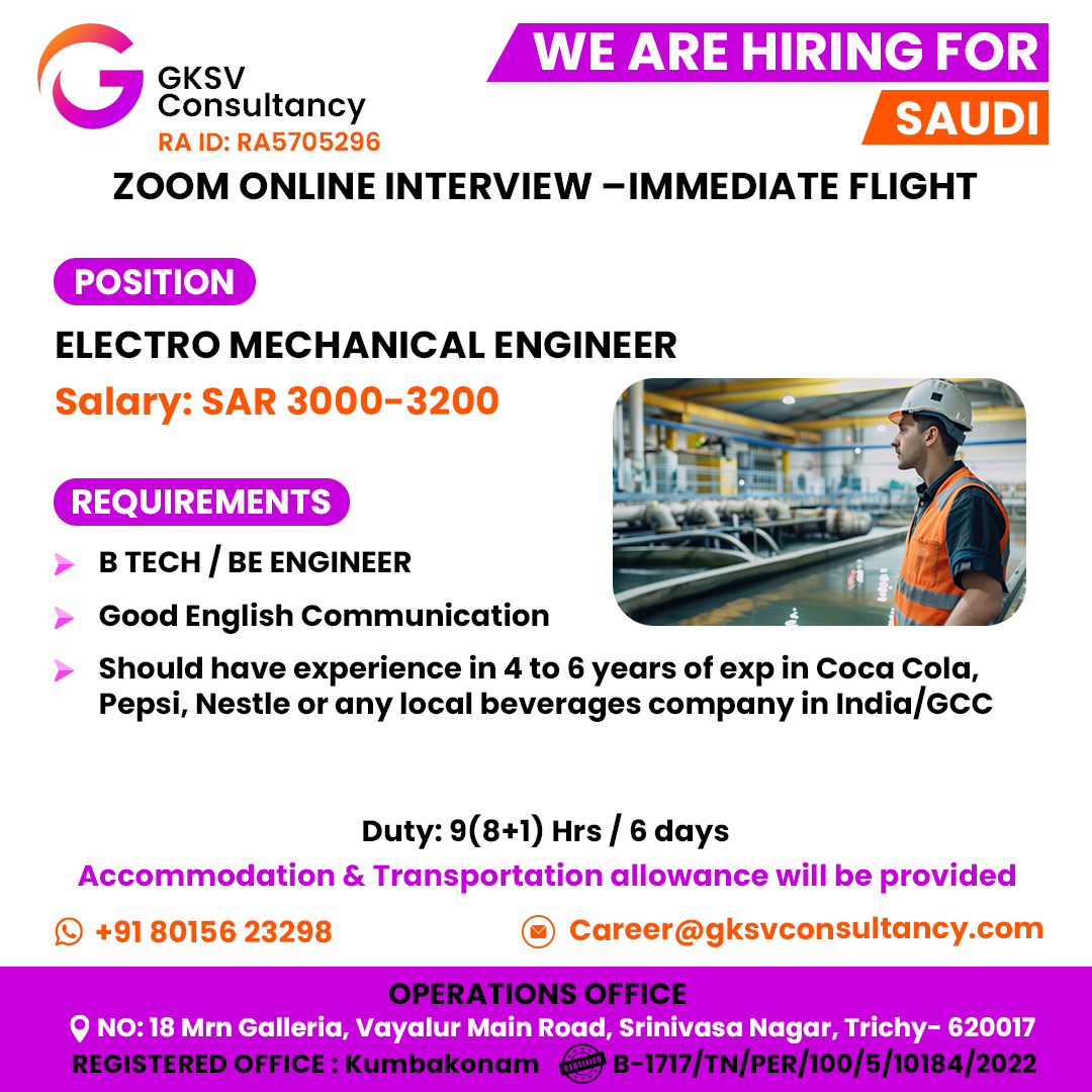 Urgent Hiring Electrician Cum Plumber for A Reputed Trading Company – Saudi Arabia