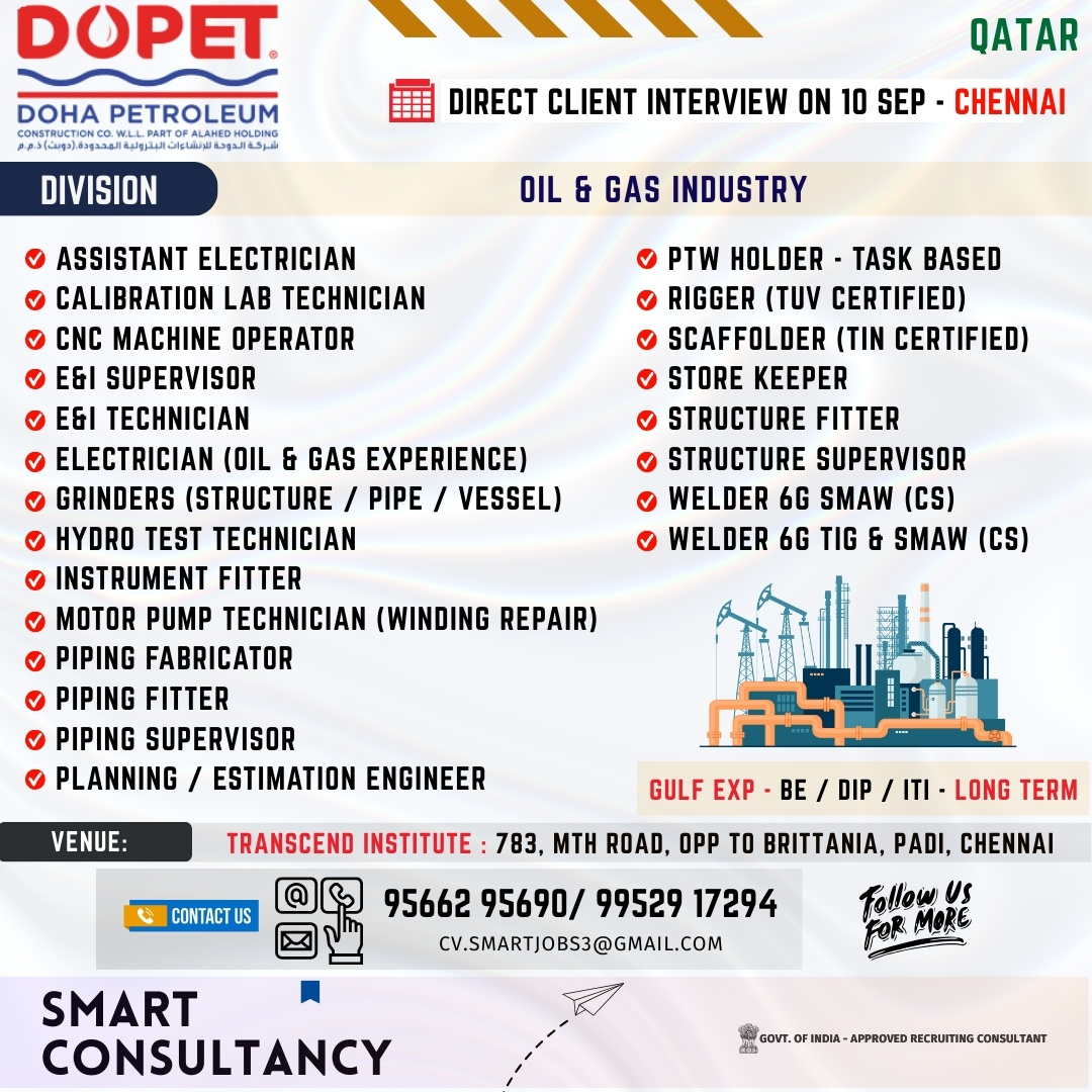 WANTED FOR A LEADING OIL & GAS COMPANY – QATAR | DIRECT CLIENT INTERVIEW ON 10th SEPTEMBER – CHENNAI