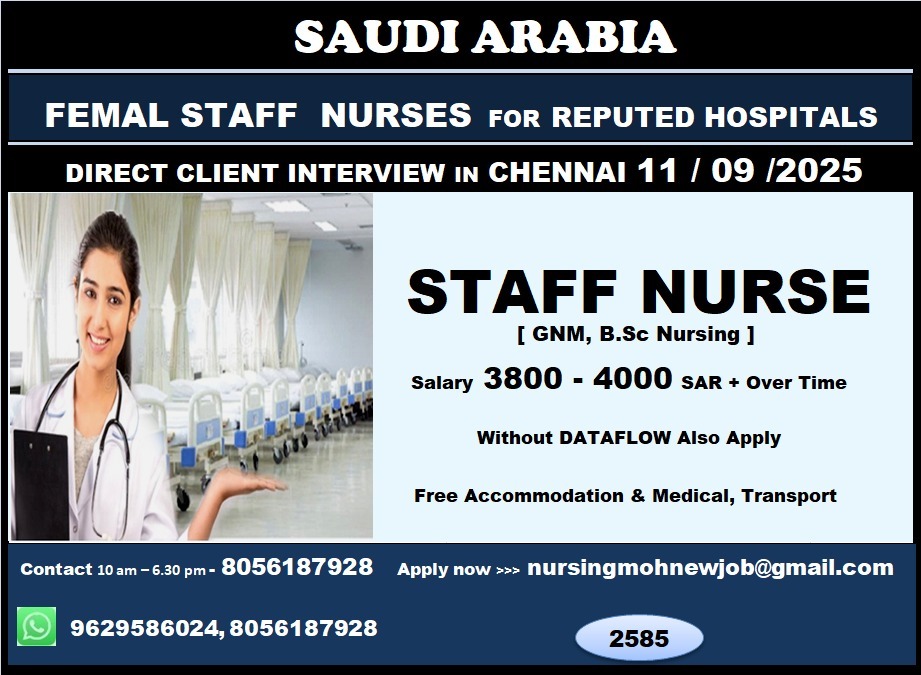 SAUDI ARABIA – FEMALE STAFF NURSES FOR REPUTED HOSPITAL DIRECT CLIENT INTERVIEW IN CHENNAI @ 11 – 9 – 2025