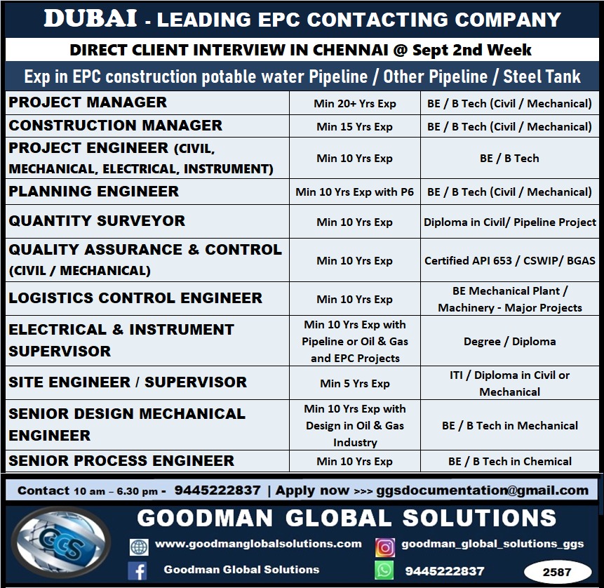 DUBAI – LEADING EPC CONTACTING COMPANY DIRECT CLIENT INTERVIEW IN CHENNAI @SEPTEMBER 2ND WEEK