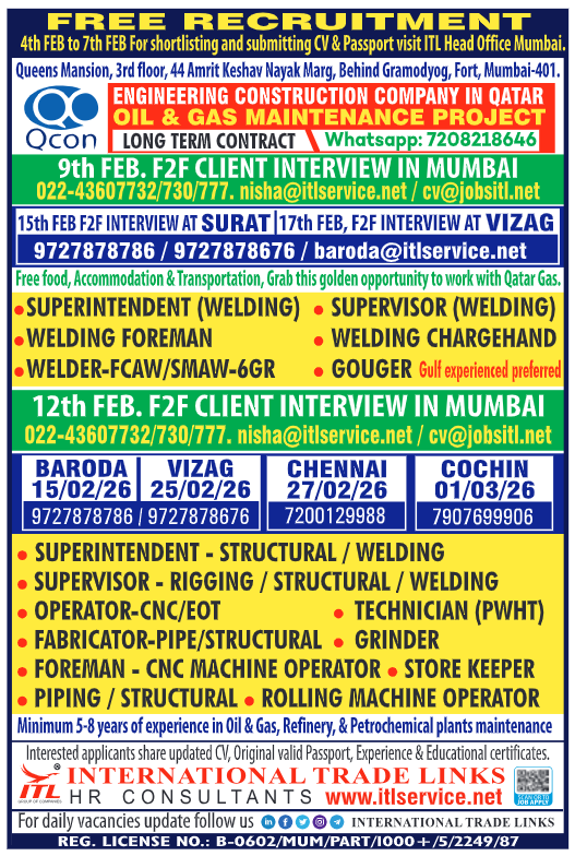 Free Recruitment Qatar: QCON Oil & Gas Jobs by International Trade Links See Job Details & Apply Gulf Job List February 4, 2026 No Comments
