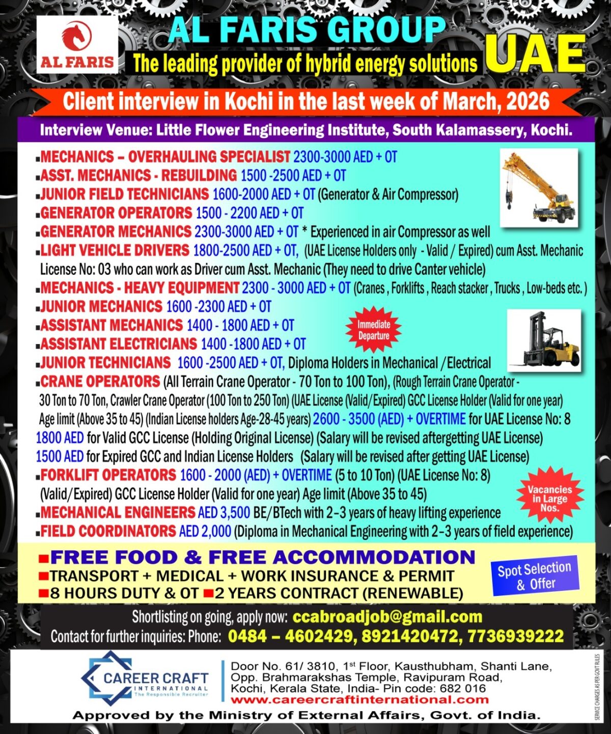 Interview venue is at Little Flower Engineering Institute, South Kalamassery, Kochi. Shortlisting is ongoing. Apply immediately to ccabroadjob@gmail.com or contact Career Craft International at +919821420472 or 0484-4602429 for further inquiries.