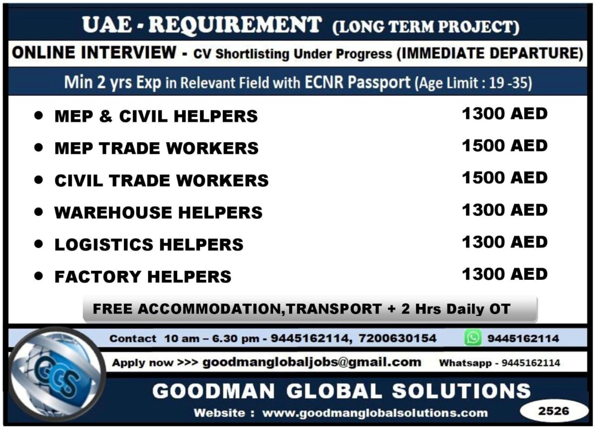 1500 AED FREE ACCOMMODATION & TRANSPORT + 2 Hrs Daily OT