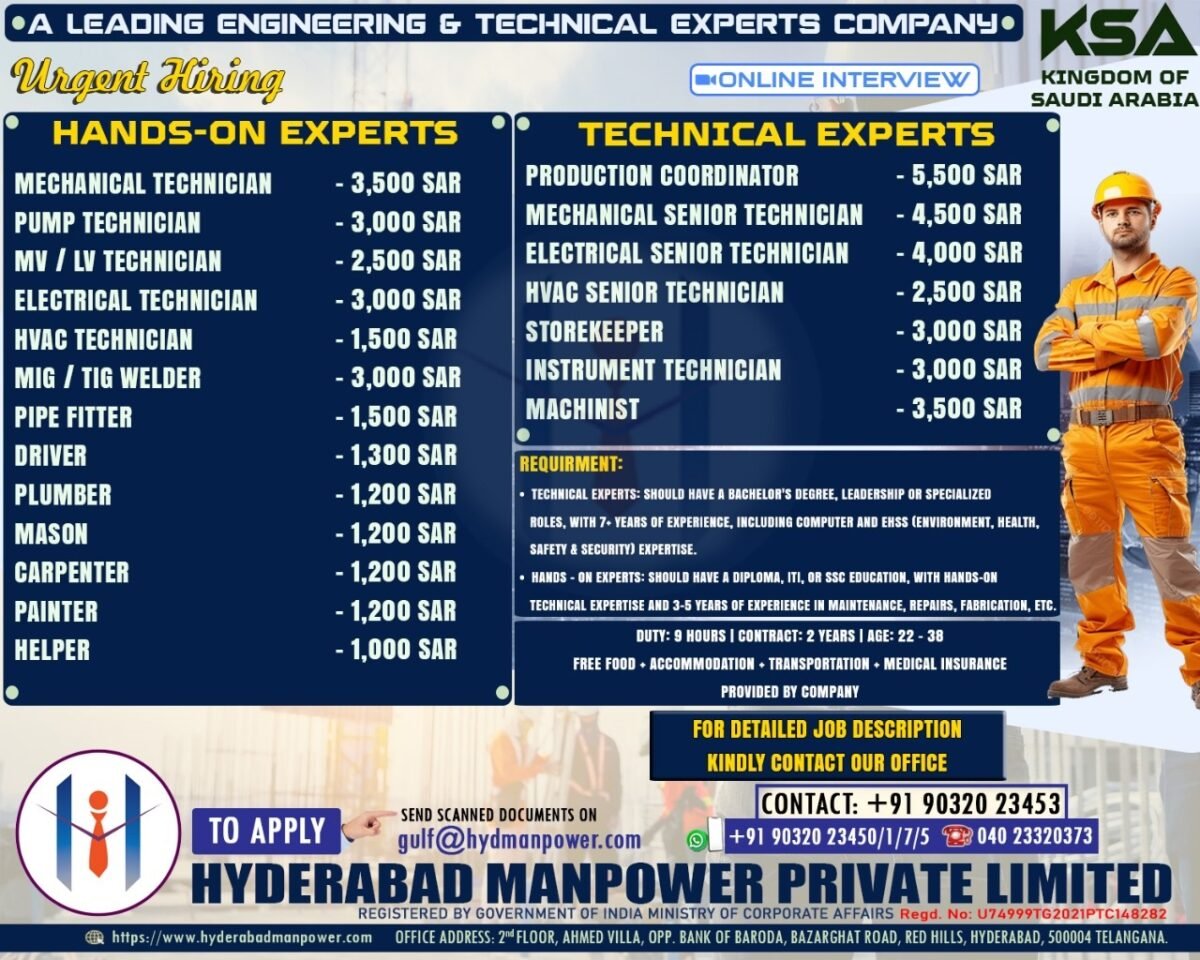 Urgent Hiring for A Leading Engineering & Technical Experts Company of Saudi Arabai