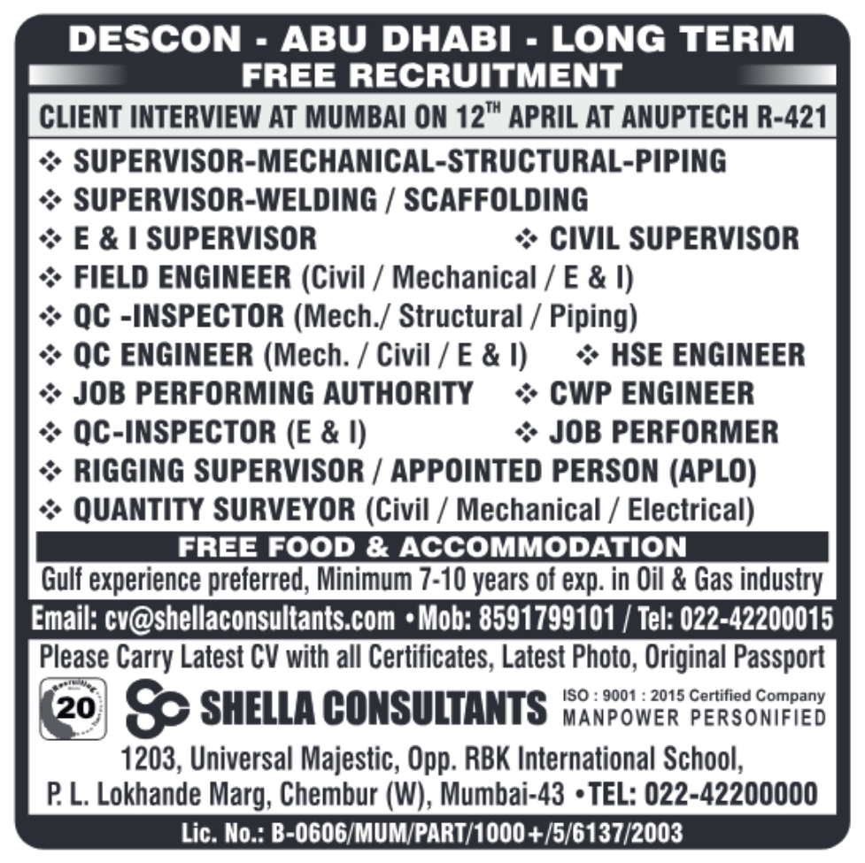 Descon, a leading company in the Oil & Gas industry, is conducting a free recruitment drive for long-term job opportunities in Abu Dhabi. If you have 7-10 years of Gulf experience, this is a great opportunity to secure a high-paying job with free food and accommodation.