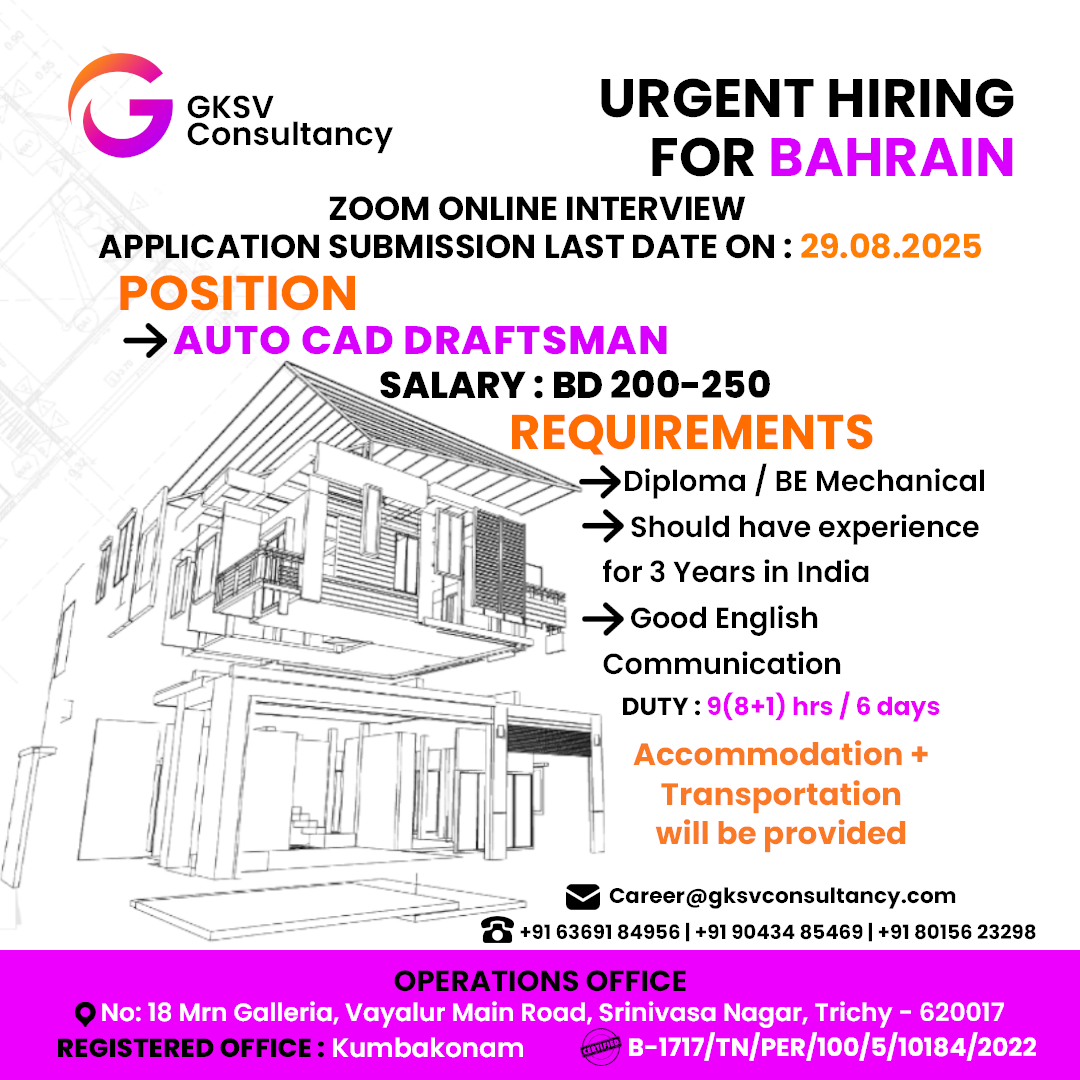 #AutoCADDraftsman #AutoCAD #draftsman #DraftsmanJobs #diploma #BEmechanical #bemechanicaljob #mechanicaljobs #ExperienceIndia #bahrain #bahrainjobs #jobs #jobsearch #jobseeker #jobsearching #jobshiring #jobseekers