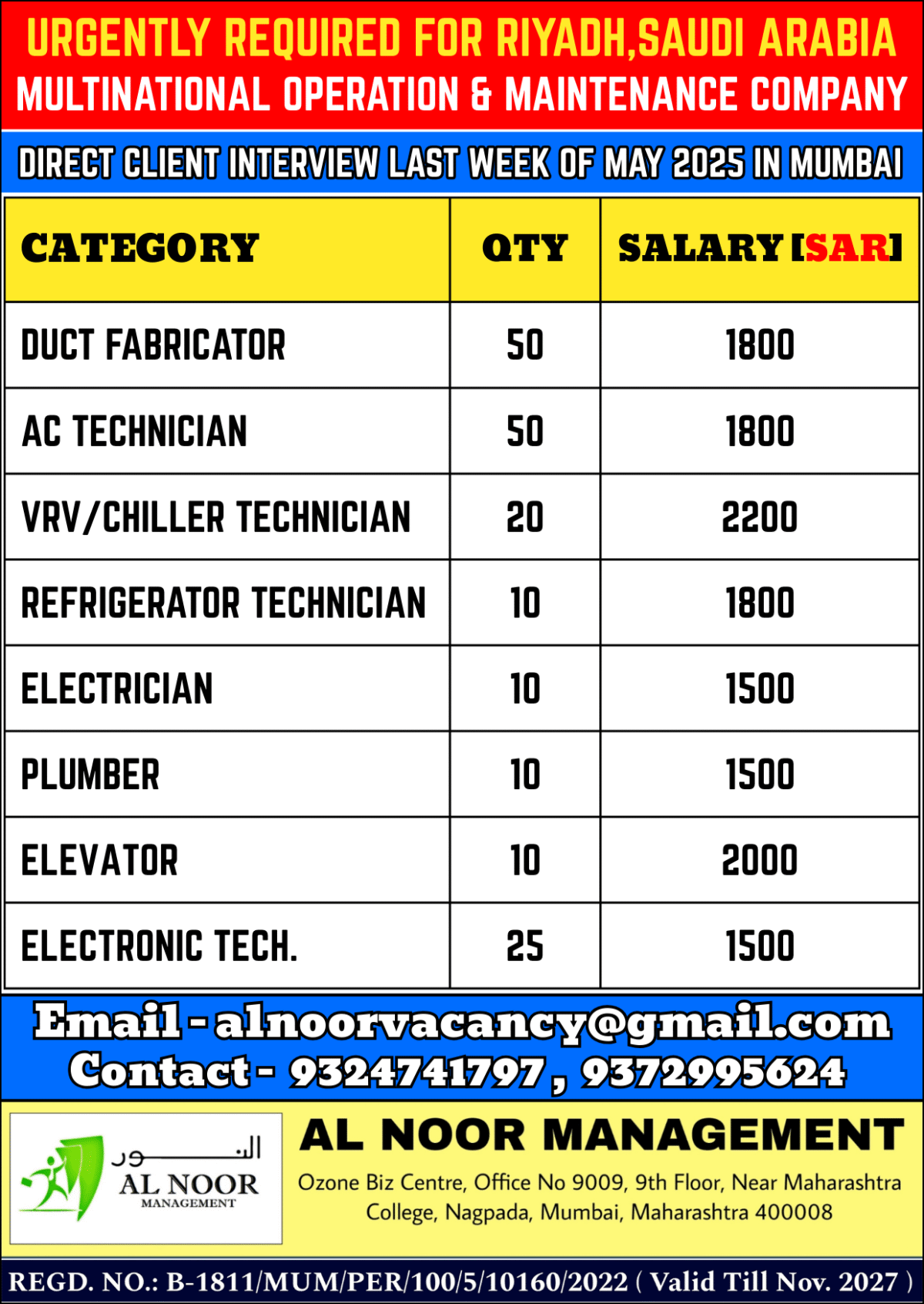 INTERVIEW LOCATION: AL NOOR MANAGAMENT, Ozone Biz Centre, 9009, 9th Floor, Bellasis Road, Near Maharashtra College, Nagpada, Mumbai-400008
