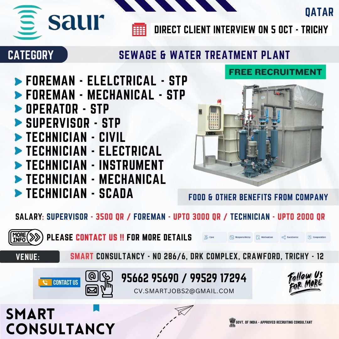 WANTED FOR A LEADING WATER TREATMENT PLANT COMPANY – QATAR / DIRECT CLIENT INTERVIEW ON 5TH OCTOBER – TRICHY