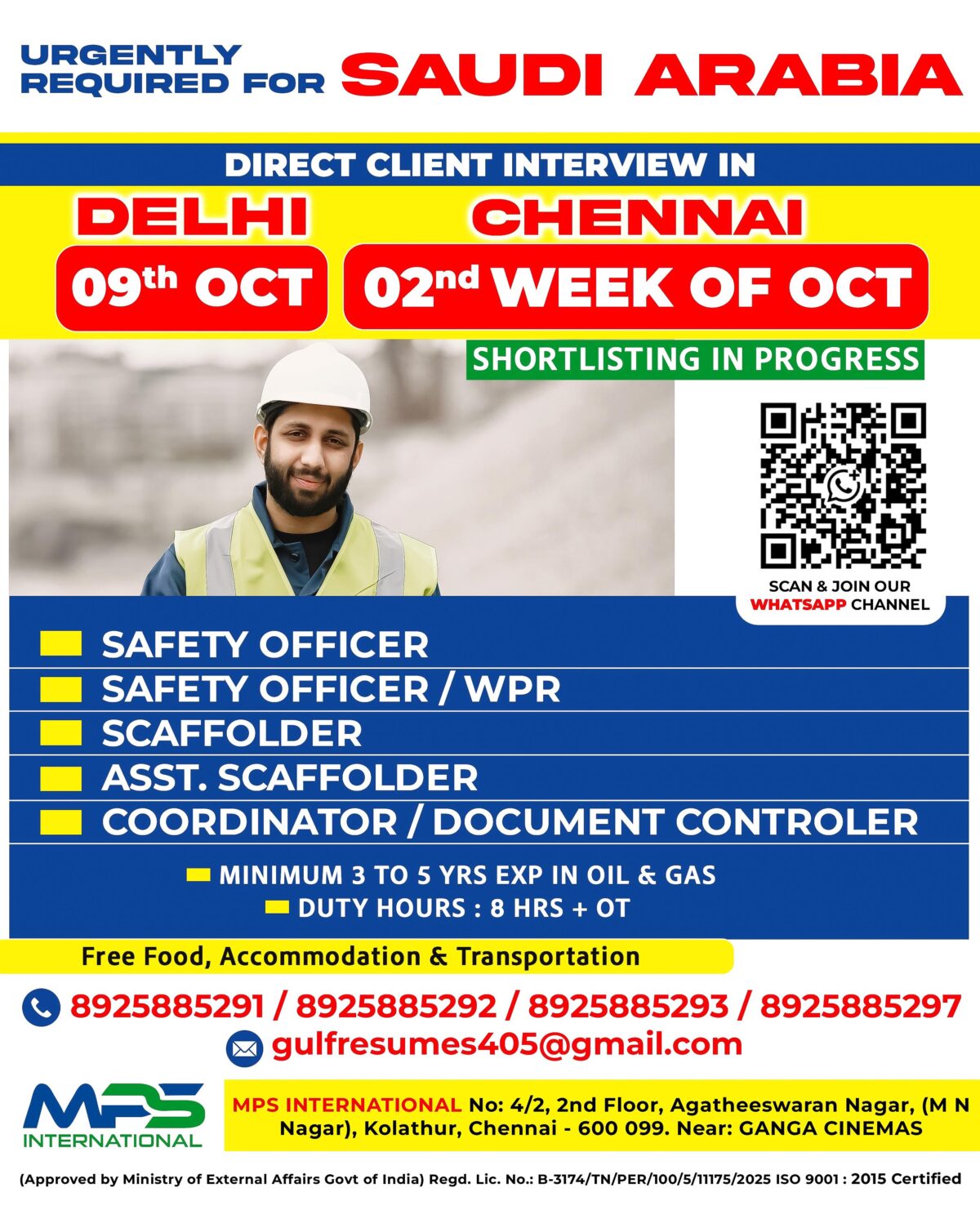 WE ARE HIRING FOR KSA DIRECT CLIENT INTERVIEW IN DELHI 09.10.2025 & CHENNAI ON 2ND WEEK OF OCTOBER 2025