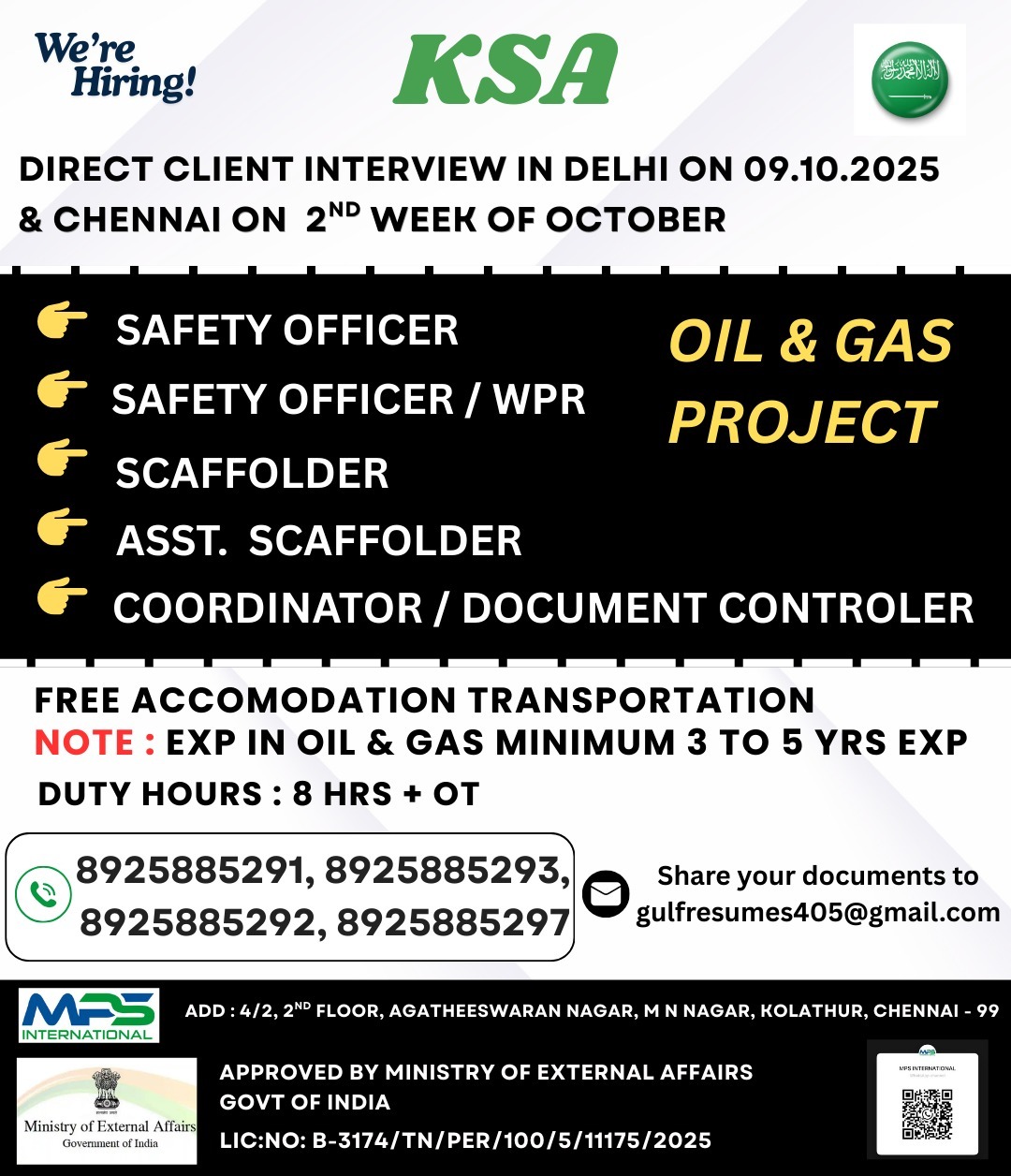 WE ARE HIRING FOR KSA DIRECT CLIENT INTERVIEW IN DELHI 09.10.2025 & CHENNAI ON 2ND WEEK OF OCTOBER 2025
